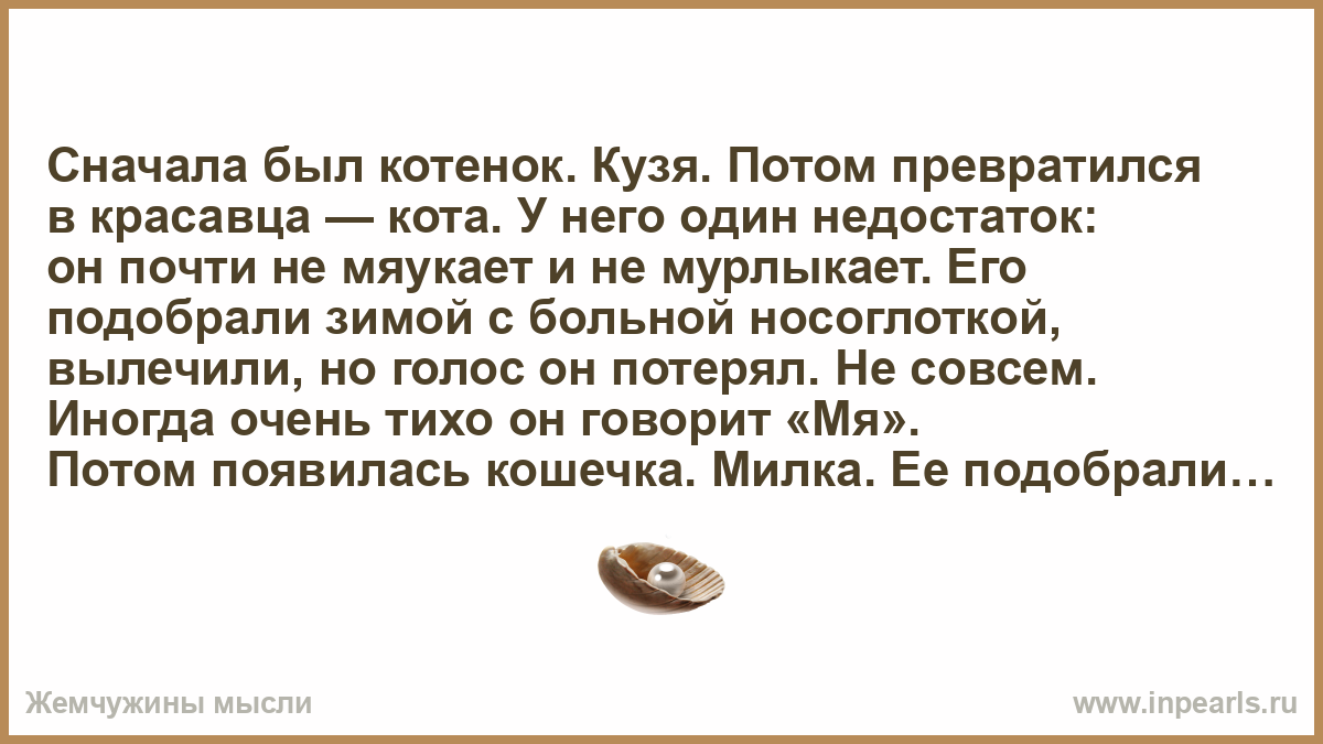 Сначала был котенок. Кузя. Потом превратился в красавца — кота. У него один недостаток: он почти не мяукает и не мурлыкает. Его подобрали зимой с больной носоглоткой, вылечили, но голос он потерял. Не совсем. Иногда очень тихо он говорит «Мя».
