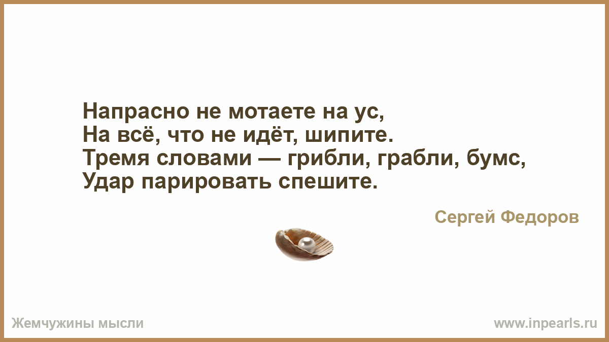 Напрасно не мотаете на ус, На всё, что не идёт, шипите. Тремя словами — грибли, грабли, бумс, Удар парировать спешите.