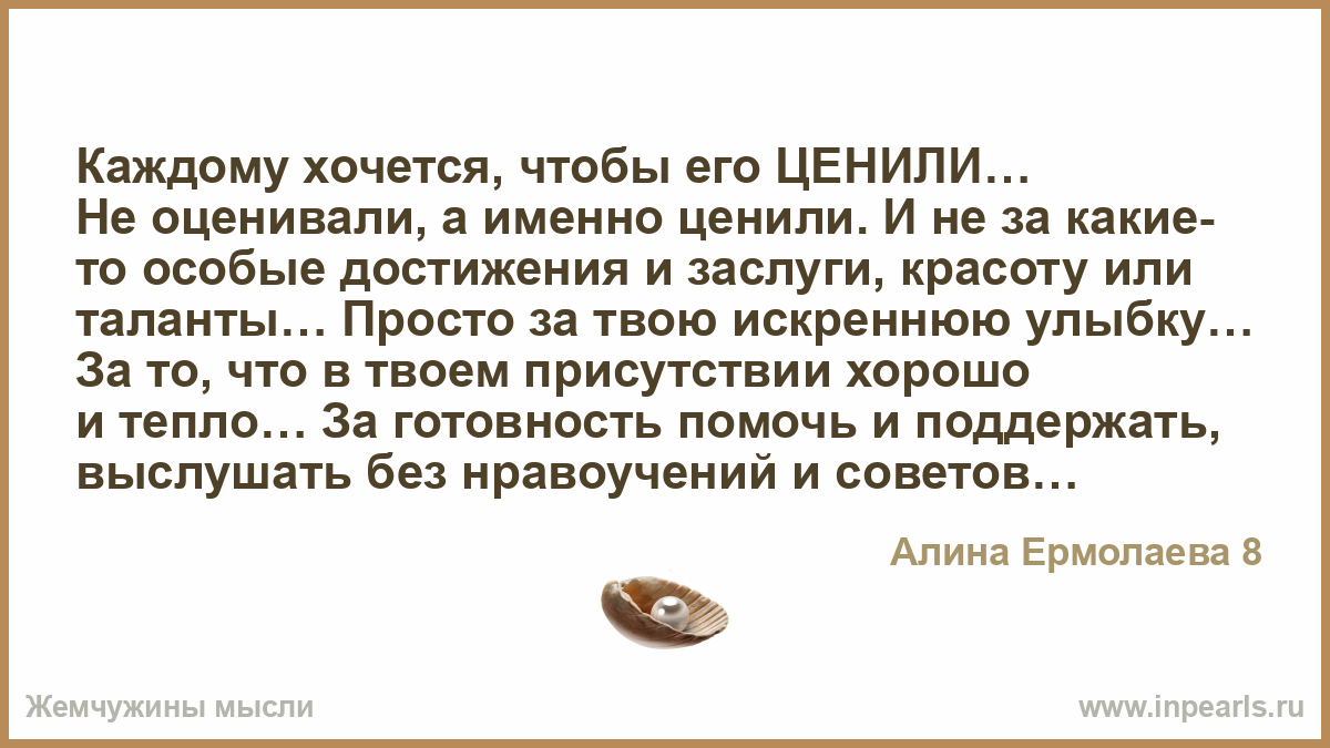 Каждому хочется, чтобы его ЦЕНИЛИ… Не оценивали, а именно ценили. И не за какие- то особые достижения и заслуги, красоту или таланты… Просто за твою искреннюю улыбку… За то, что в твоем присутствии хорошо и тепло… За готовность помочь и поддержать, выслушать без нравоучений и советов… За бескорыстную помощь… За то, что ты скромный и не открываешь дверь ногой… За твою способность сочувствовать и сопереживать… За то, что не помнишь зла… За то, что любишь смотреть на звезды и гулять под дождем… Просто за то, что ты ЕСТЬ … Мы все стремимся быть с теми, для кого являемся важными и нужными, кто не обесценивает нашу значимость и не ищет нам замены… Кто нуждается в нас… Кто всегда нас ждет! Кто верит в нас и любит.