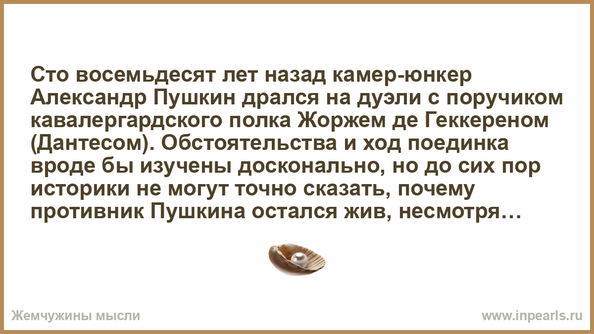 Сто восемьдесят лет назад камер-юнкер Александр Пушкин дрался на дуэли с поручиком кавалергардского полка Жоржем де Геккереном (Дантесом). Обстоятельства и ход поединка вроде бы изучены досконально, но до сих пор историки не могут точно сказать, почему противник Пушкина остался жив, несмотря на попадание пули в грудь? Спасла его собственная рука, которой он защищался, медная пуговица или он смухлевал и воспользовался дополнительной защитой — такая версия время от времени всплывает в публикациях.