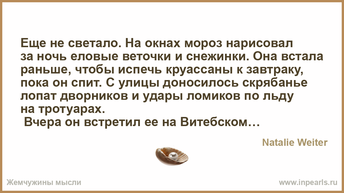 Еще не светало. На окнах мороз нарисовал за ночь еловые веточки и снежинки. Она встала раньше, чтобы испечь круассаны к завтраку, пока он спит. С улицы доносилось скрябанье лопат дворников и удары ломиков по льду на тротуарах.