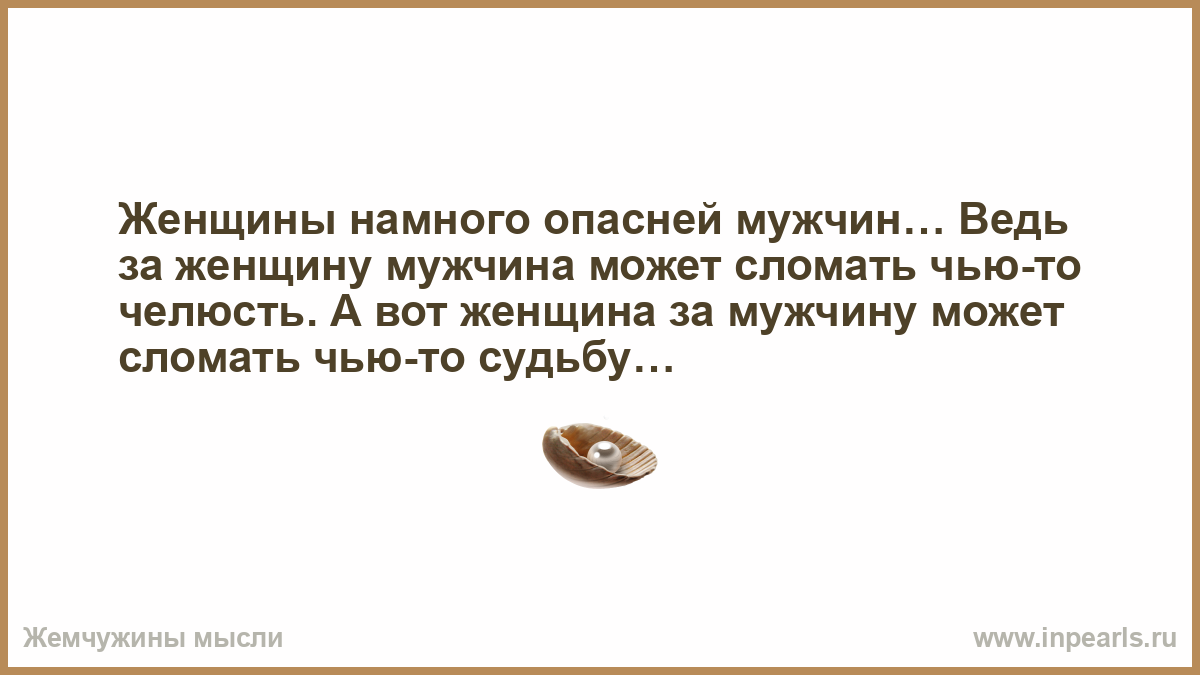 Женщины намного опасней мужчин… Ведь за женщину мужчина может сломать чью-то челюсть. А вот женщина за мужчину может сломать чью-то судьбу…