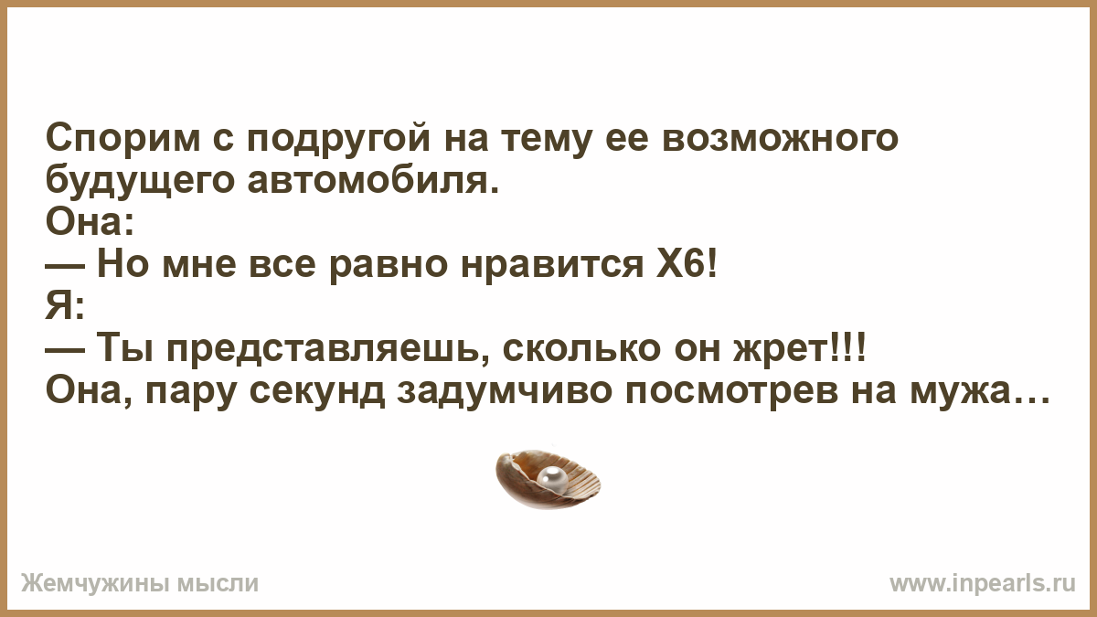 — Вот я сейчас его жена, потому что он мне понравился! А если б я задумывалась, сколько он жрет, я бы никогда за него не вышла!