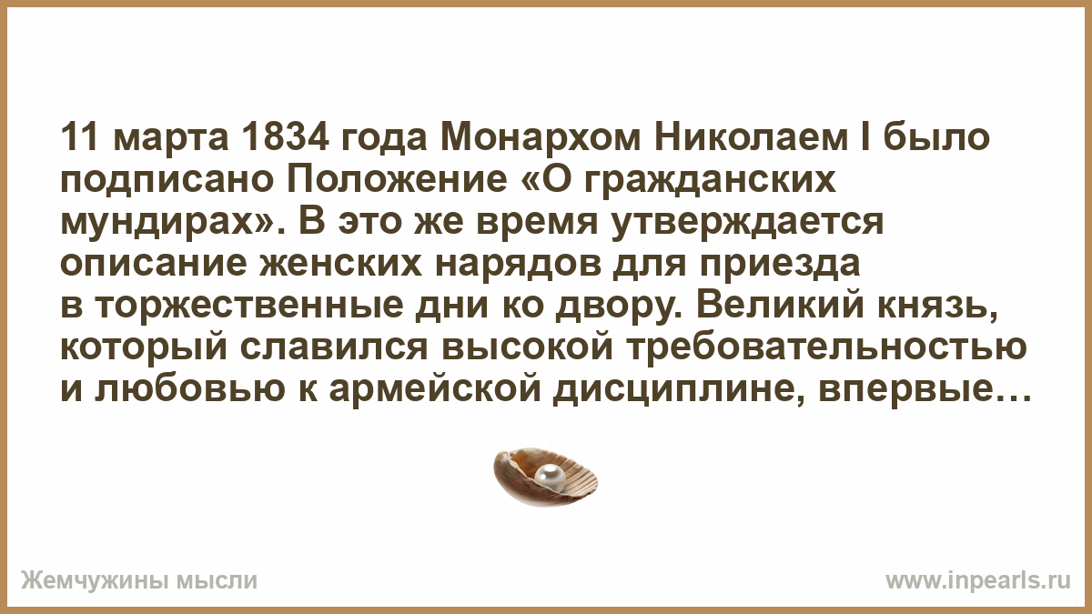 11 марта 1834 года Монархом Николаем I было подписано Положение «О гражданских мундирах». В это же время утверждается описание женских нарядов для приезда в торжественные дни ко двору. Великий князь, который славился высокой требовательностью и любовью к армейской дисциплине, впервые за всю историю документально утвердил требования к внешнему виду государственного служащего. Фактически положив начало первому официальному «дресс-коду».