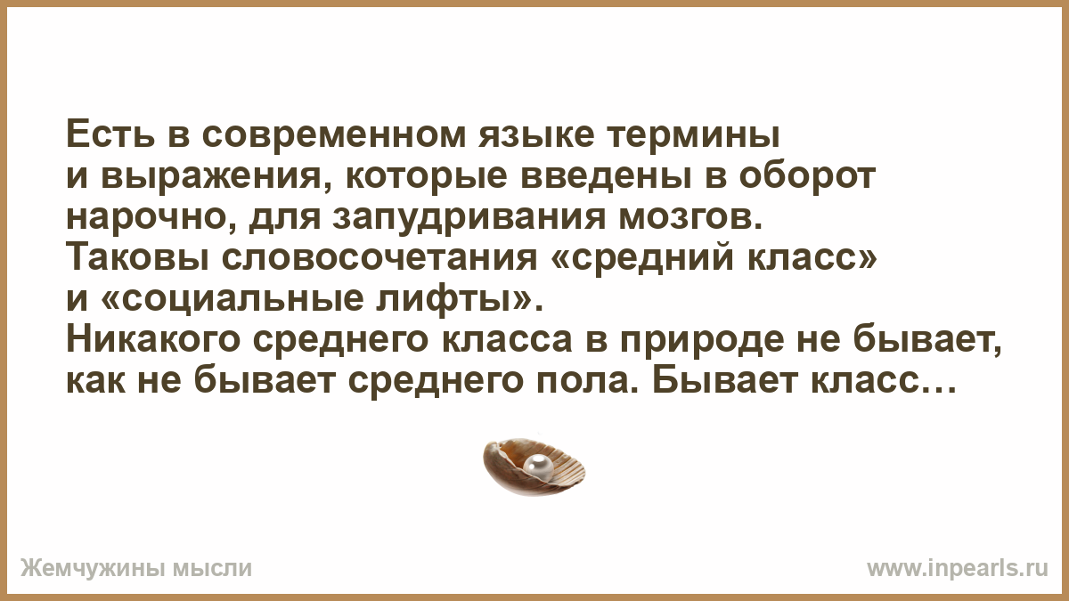 Но вот нам сунули в зубы красивую формулу. Носимся с ней, как собака с палкой. «Средний класс» — некий промежуточный класс, «поднимающийся по жизни», не самый низкий, но еще и не вполне процветающий. Класс, которому еще не классно, но уже и не тошно. Класс, который перемещается с этажа на этаж (ведь наше общество — офис, корпорация, пирамида, а как иначе?) с помощью «социальных лифтов» — еще одного идиотского фразеологизма. Класс, про который так ладно поют лучшие выразители его классовых интересов, Настя и Потап: