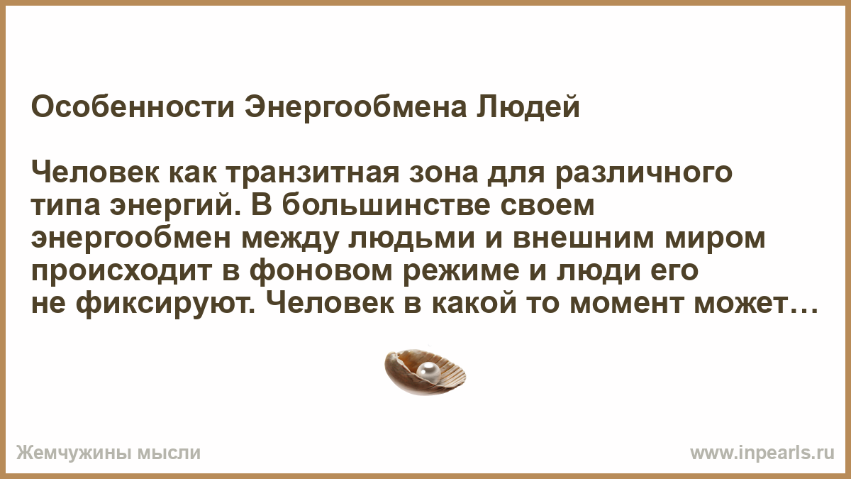 Человек как транзитная зона для различного типа энергий. В большинстве своем энергообмен между людьми и внешним миром происходит в фоновом режиме и люди его не фиксируют. Человек в какой то момент может начать наблюдение за этим процессом, но как показывает практика, быстро выходит из этого состояния.